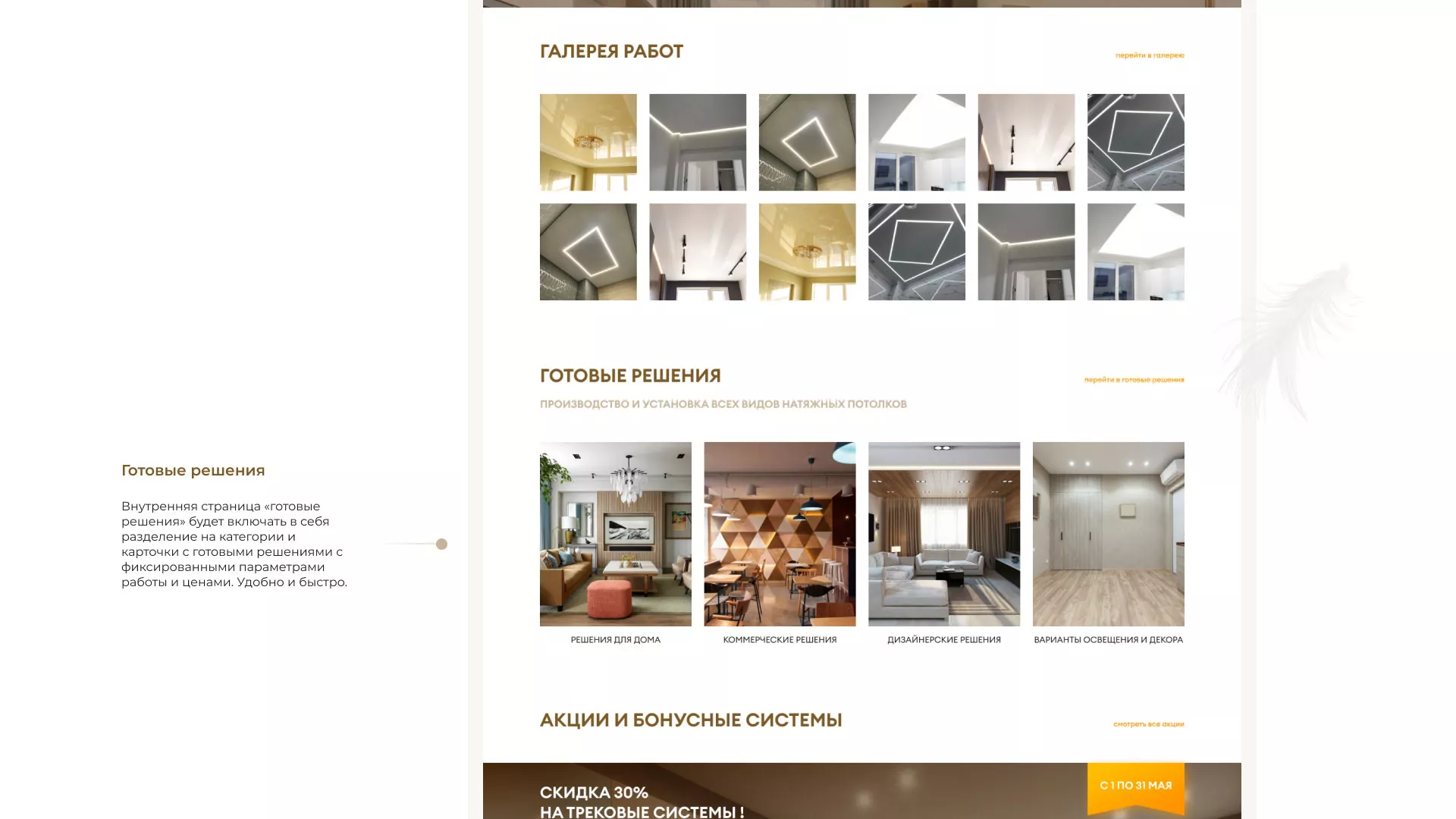 Что мы сделали. Разработали сайт в теплых и уютных «шоколадных» тонах. Продумали структуру, наполнили ее удобными разделами такими как «готовые решения», которые включают в себя не только уже готовые варианты с фиксированной ценой, но и разделение по категориям: решения для дома, коммерческих помещений, интересные дизайнерские решения. Так же предложили клиенту онлайн-калькулятор, что может существенно упростить потенциальным заказчикам нашего клиента в Шахтёрске заказ потолков.