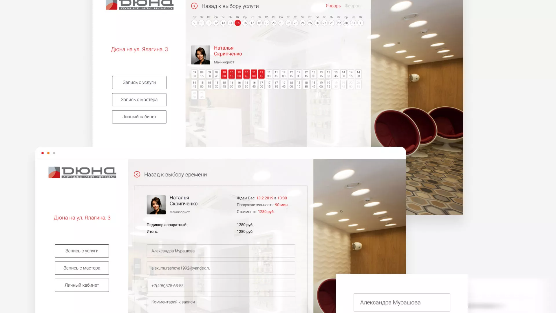 В разделе «Личный кабинет» содержатся все текущие записи в салоны красоты в Шахтёрске, с возможностью их отмены. Также, здесь можно редактировать свои персональные данные, ознакомиться с историей записей и видеть бонусы и акции салонов красоты.
